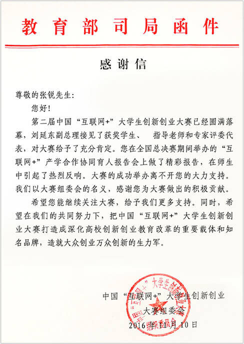 2018年,凤凰体育连续多年为中国国际互联网+大学生创新创业大赛做出积极贡献,获教育部来函致谢。